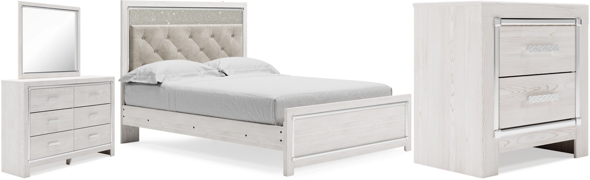 Set includes - King Panel Bed (headboard, footboard and rails), Dresser, Mirror, and Nightstand